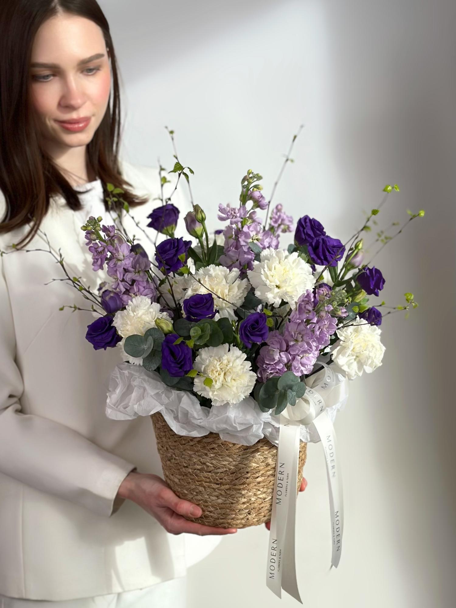 АРОМАТНАЯ МАТТИОЛА, ЭУСТОМА, ВЕСЕННИЕ ВЕТОЧКИ В ПЛЕТЕНОЙ КОРЗИНЕ