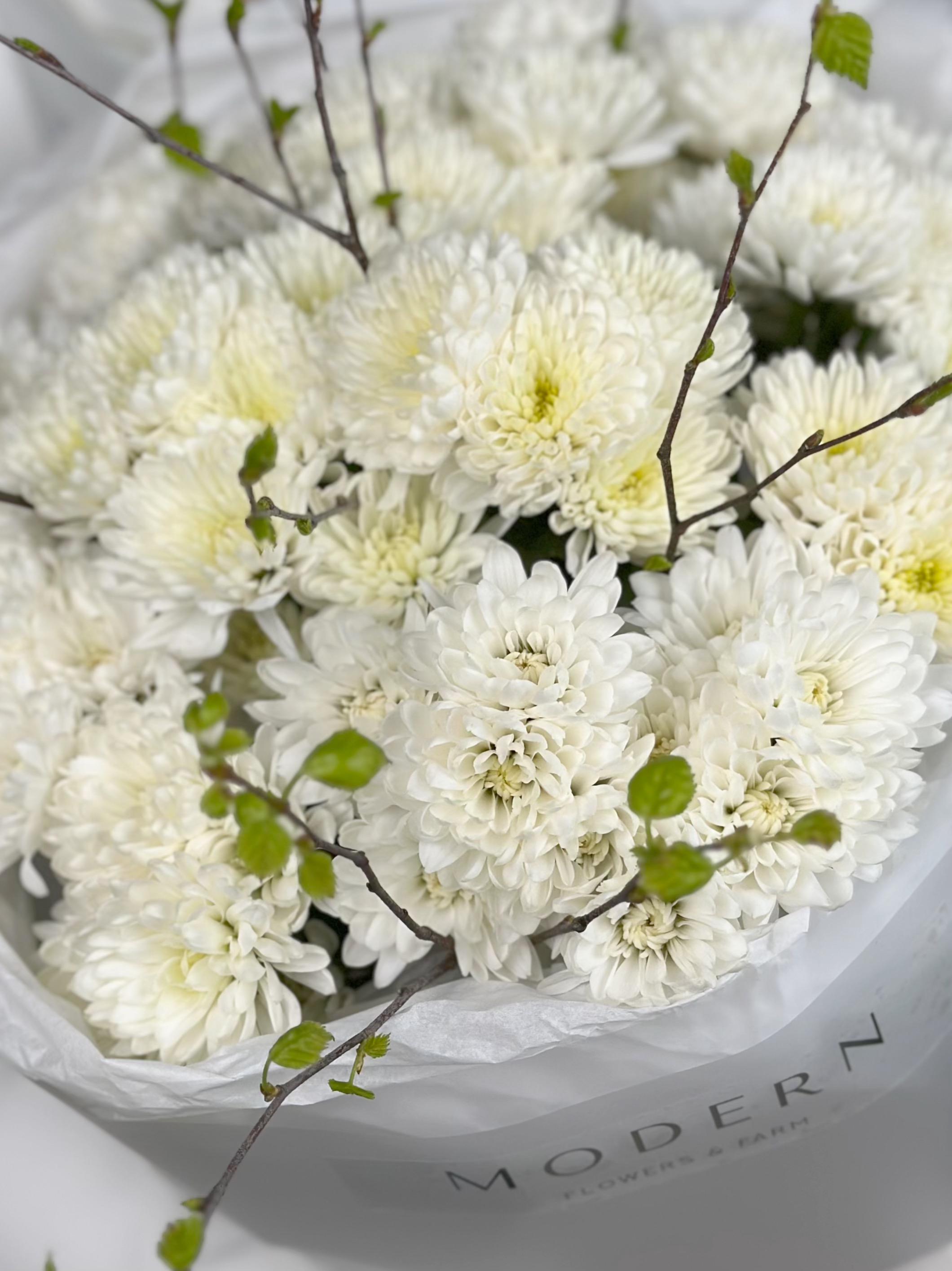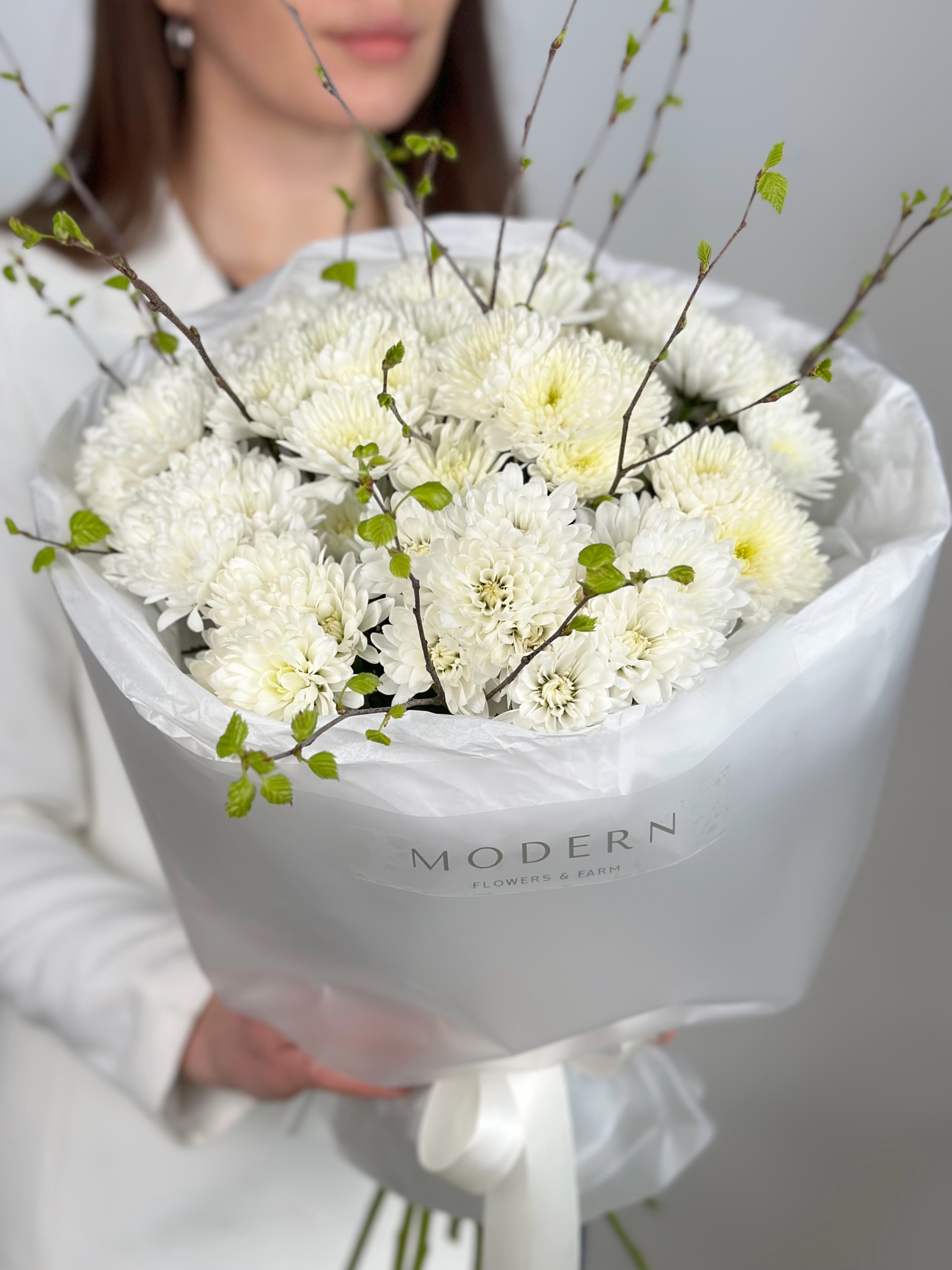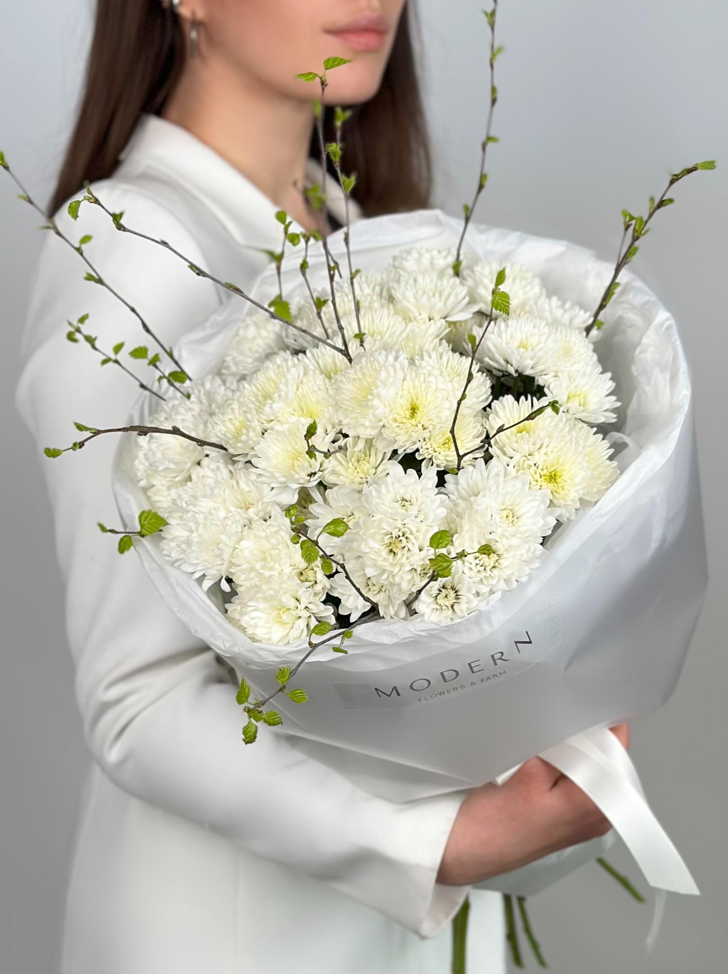 БЕЛОСНЕЖНЫЙ БУКЕТ ИЗ ХРИЗАНТЕМЫ И ВЕСЕННИХ ВЕТОЧЕК