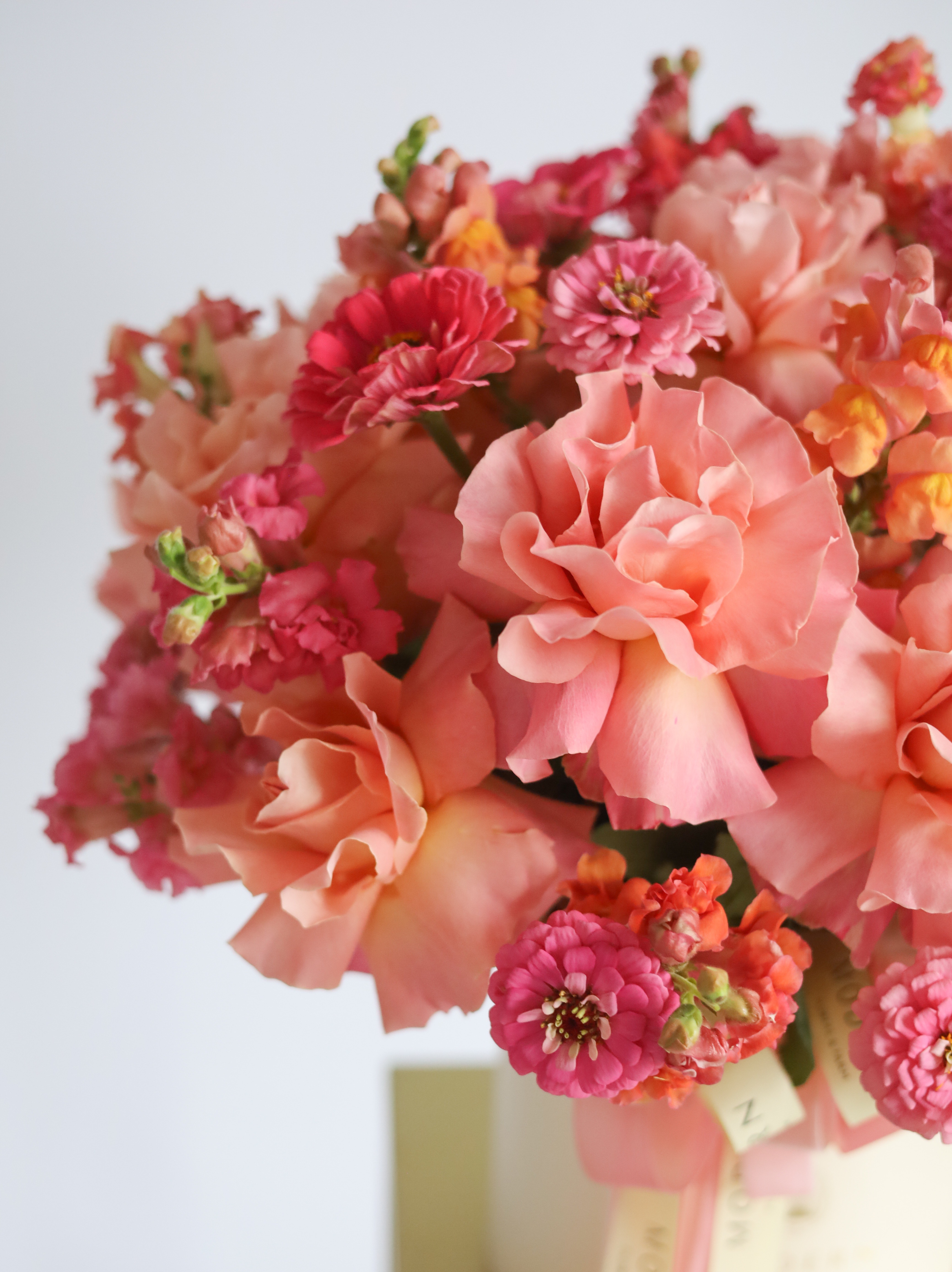 Цинния добавляет композиции яркости и объема, привнося в букет нотки природной свежести и жизнерадостности.