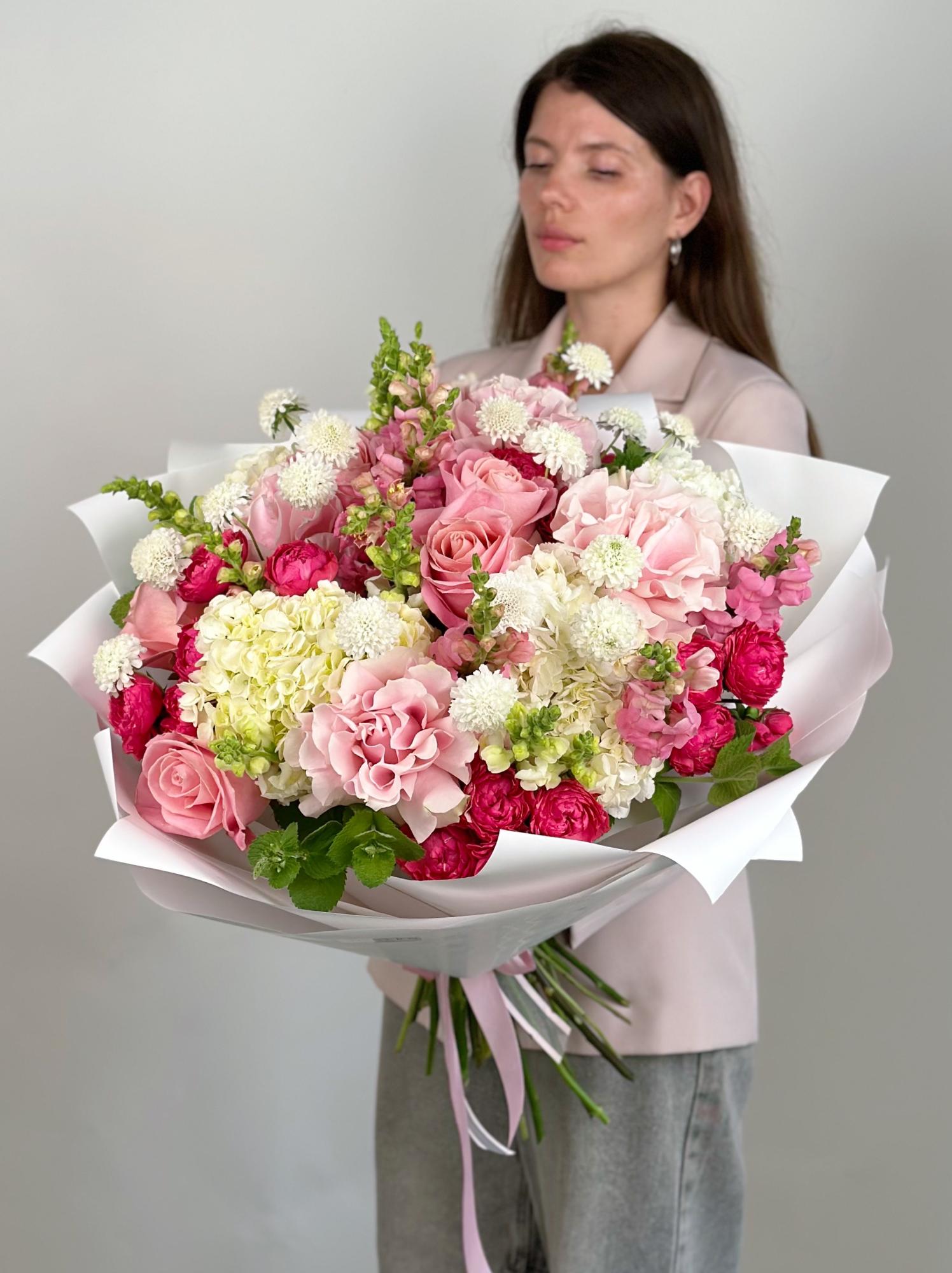 Большой торжественный букет: роскошь пионовидных роз, гортензий и львиного зева