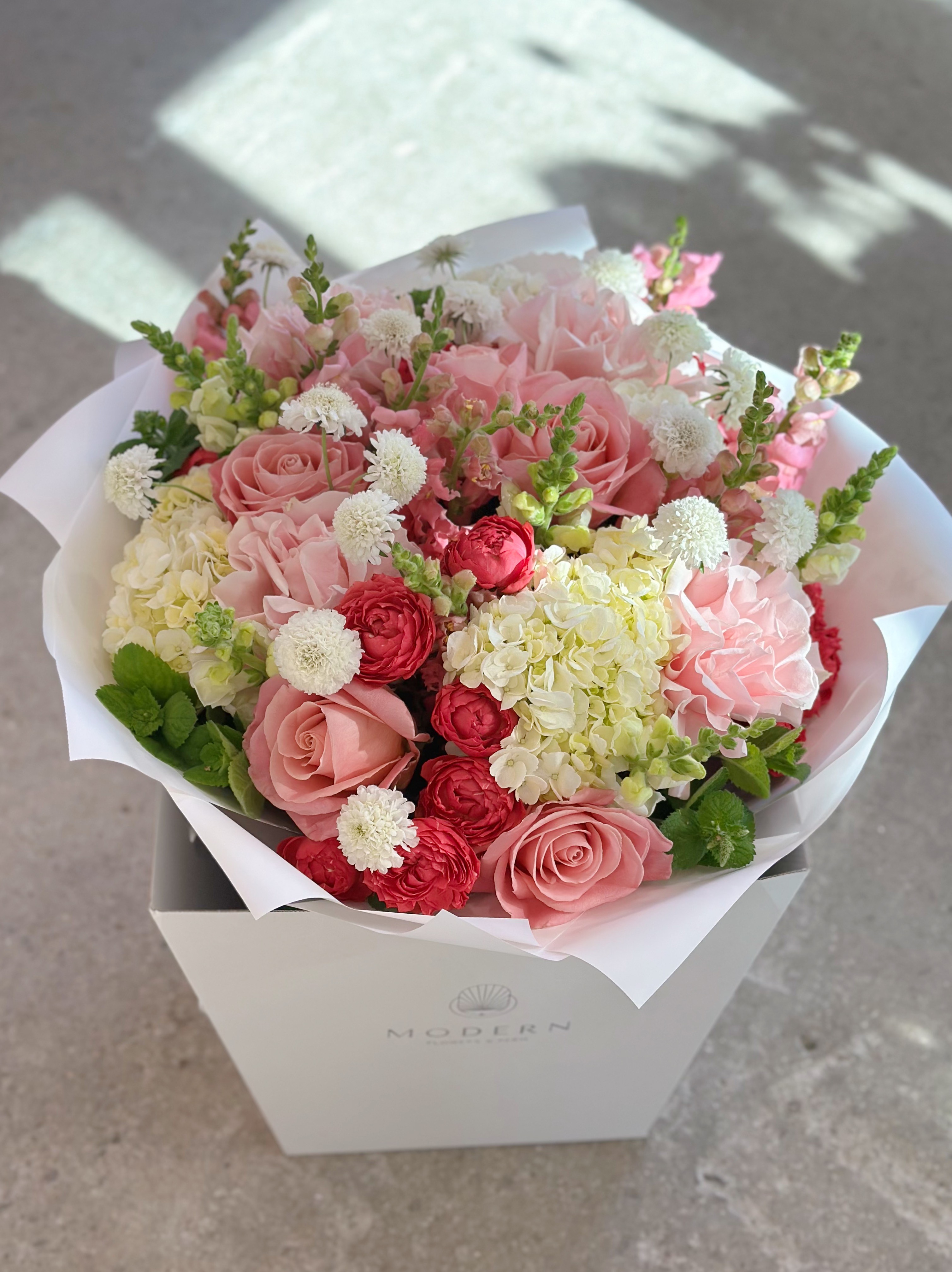 Представляем вашему вниманию торжественную цветочную композицию, где благородство пионовидных роз переплетается с изяществом гортензий и утонченностью львиного зева.
