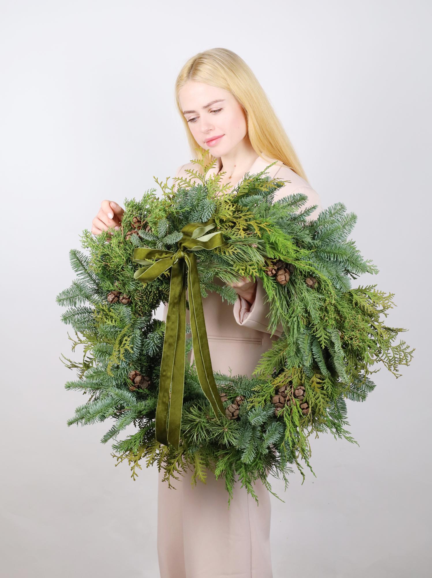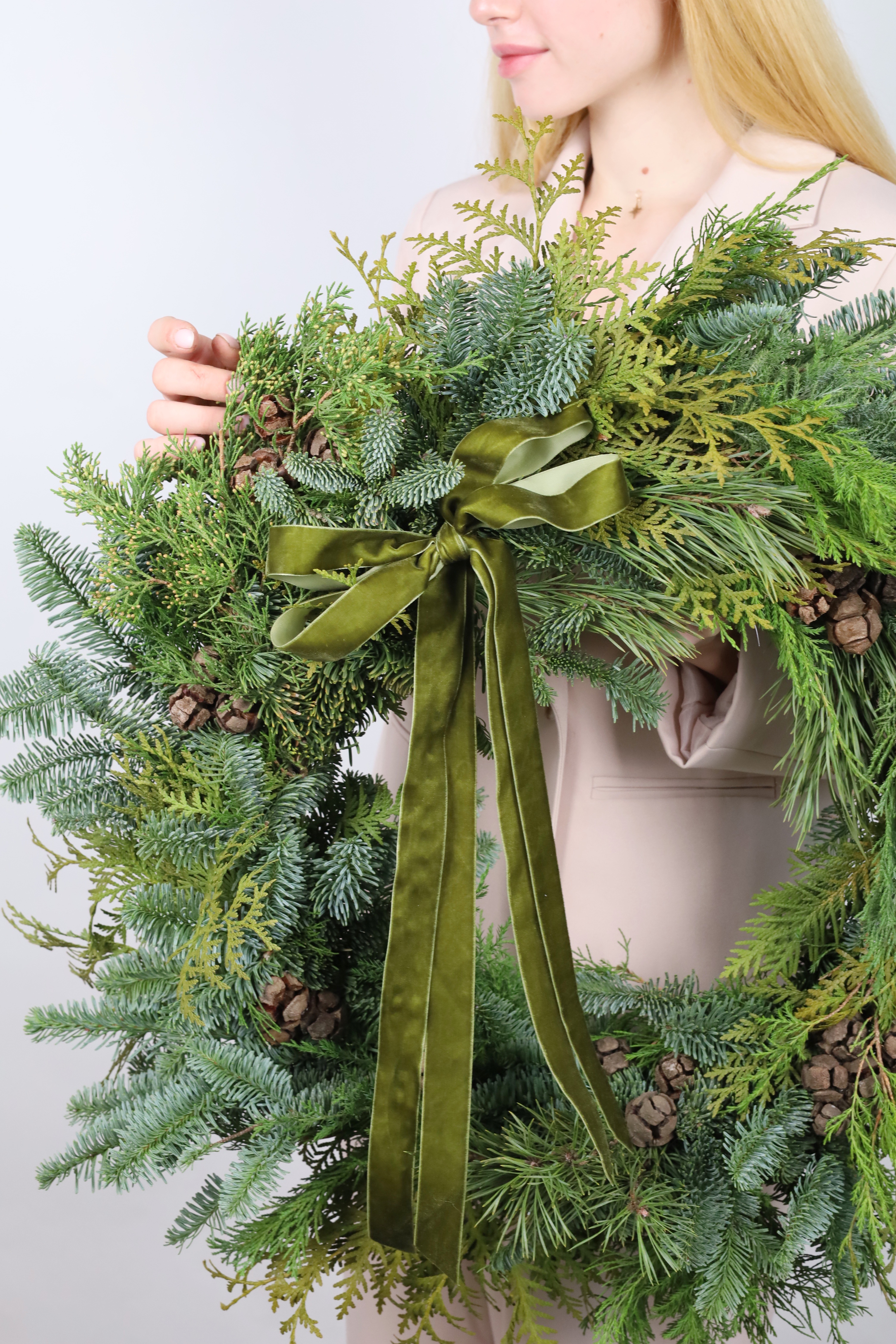 —БОЛЬШОЙ ВЕНОК ИЗ МИКСА ХВОИ С КЕДРОВЫМИ ШИШКАМИ И БАРХАТНЫМ БАНТОМ