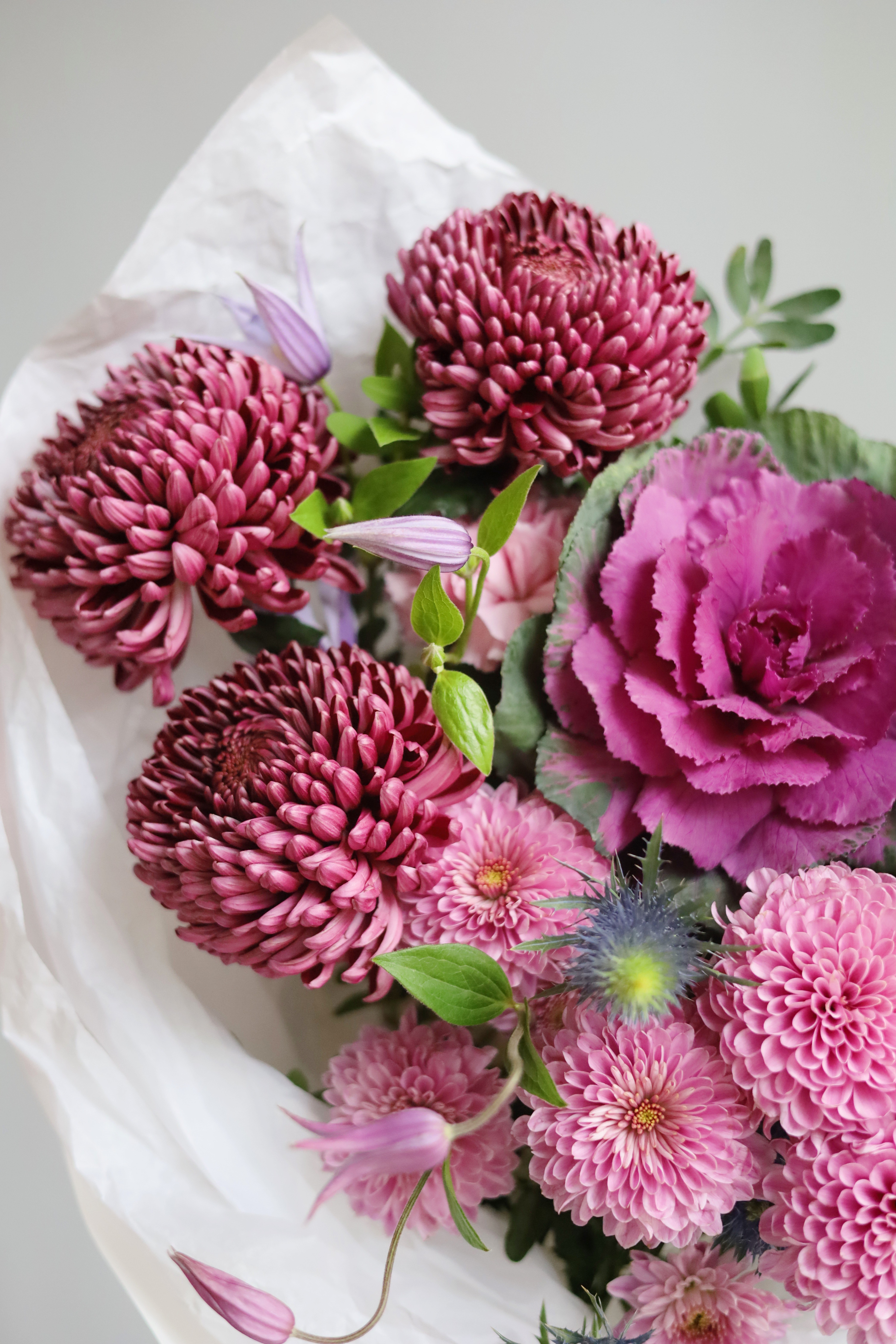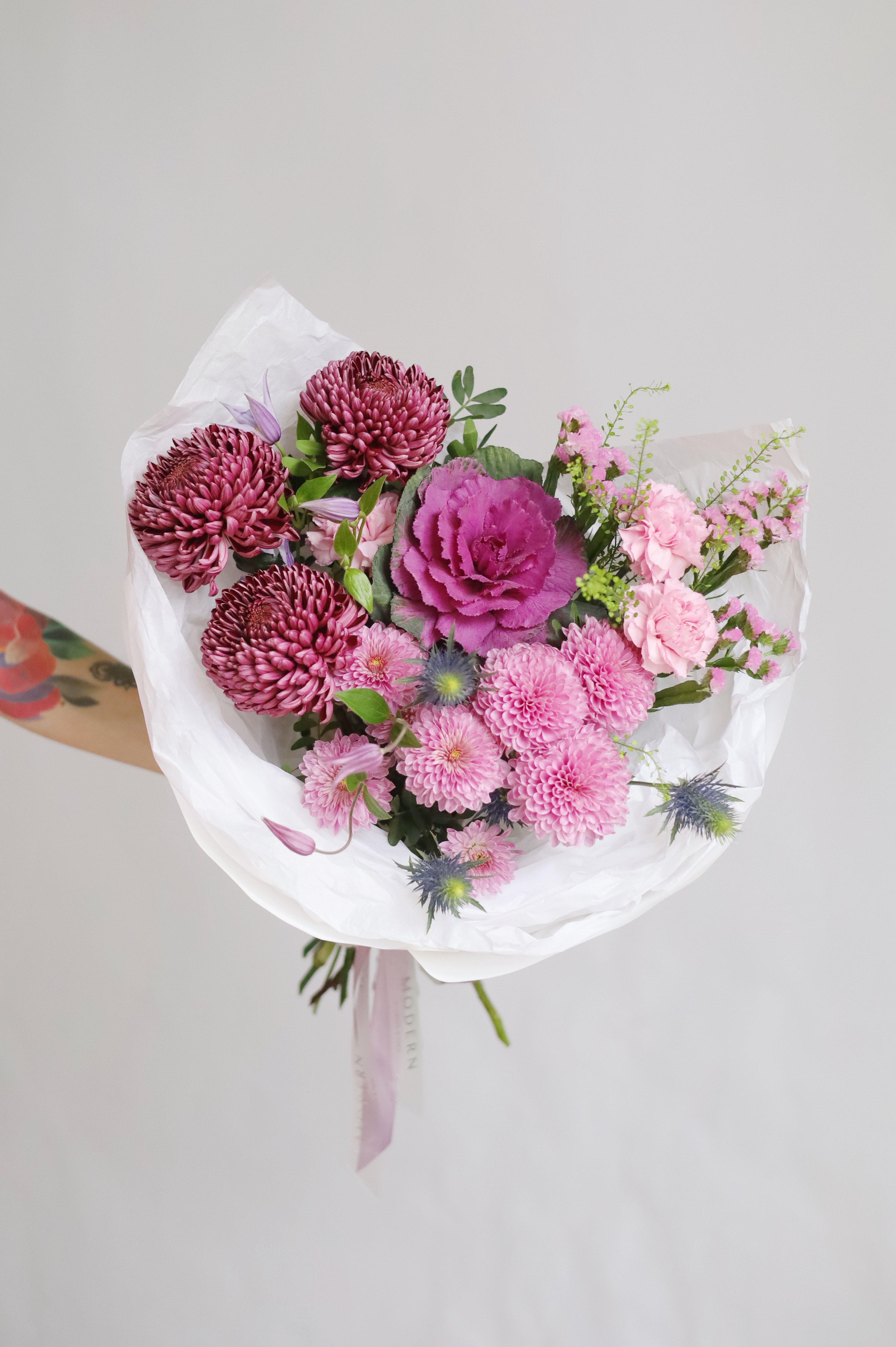 БУКЕТ ИЗ СТОЙКИХ ЦВЕТОВ В ФИОЛЕТОВОМ ОТТЕНКЕ