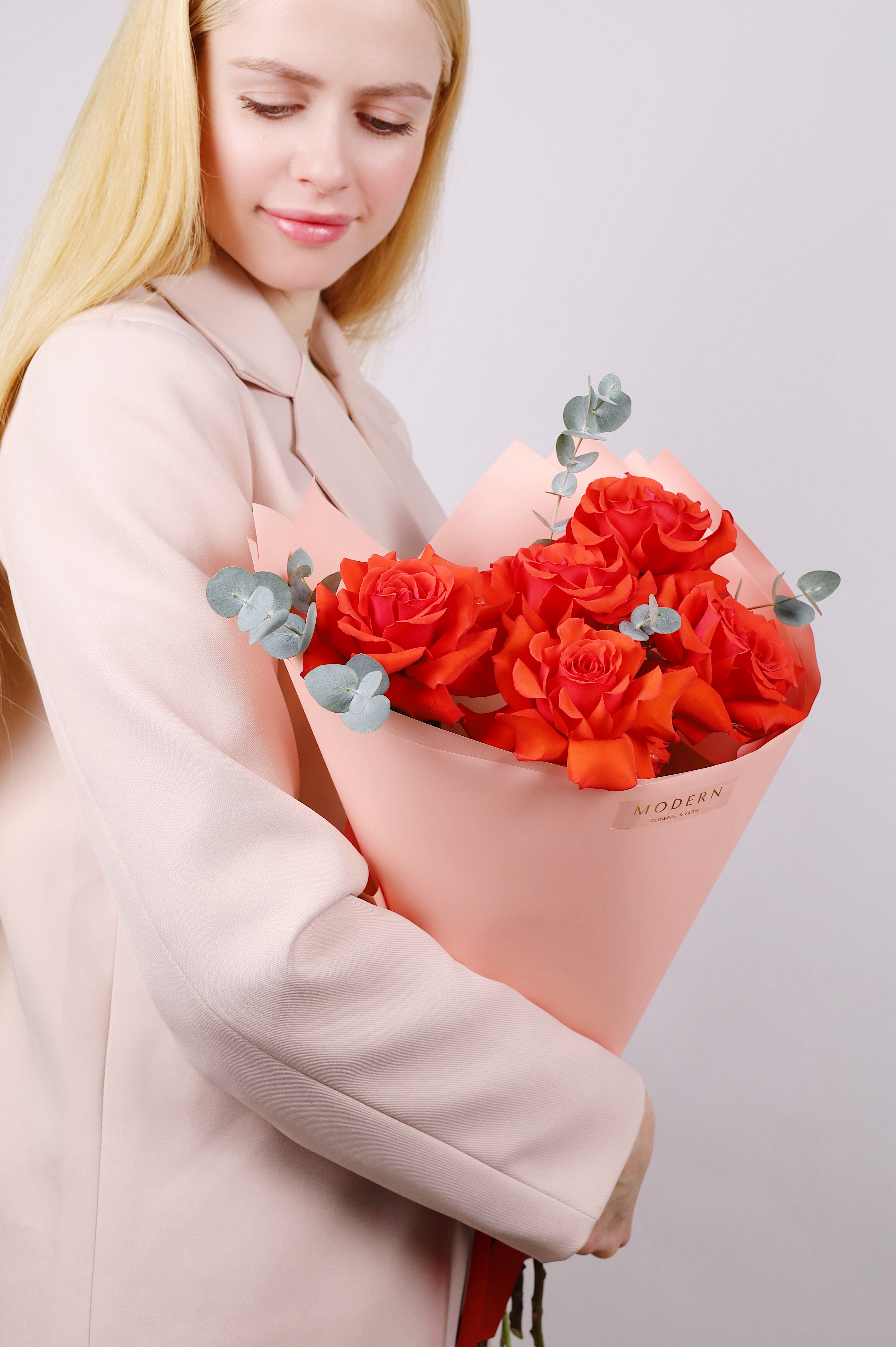 БУКЕТ ИЗ СТОЙКОЙ АЛОЙ ФРАНЦУЗСКОЙ РОЗЫ И ЭВКАЛИПТА