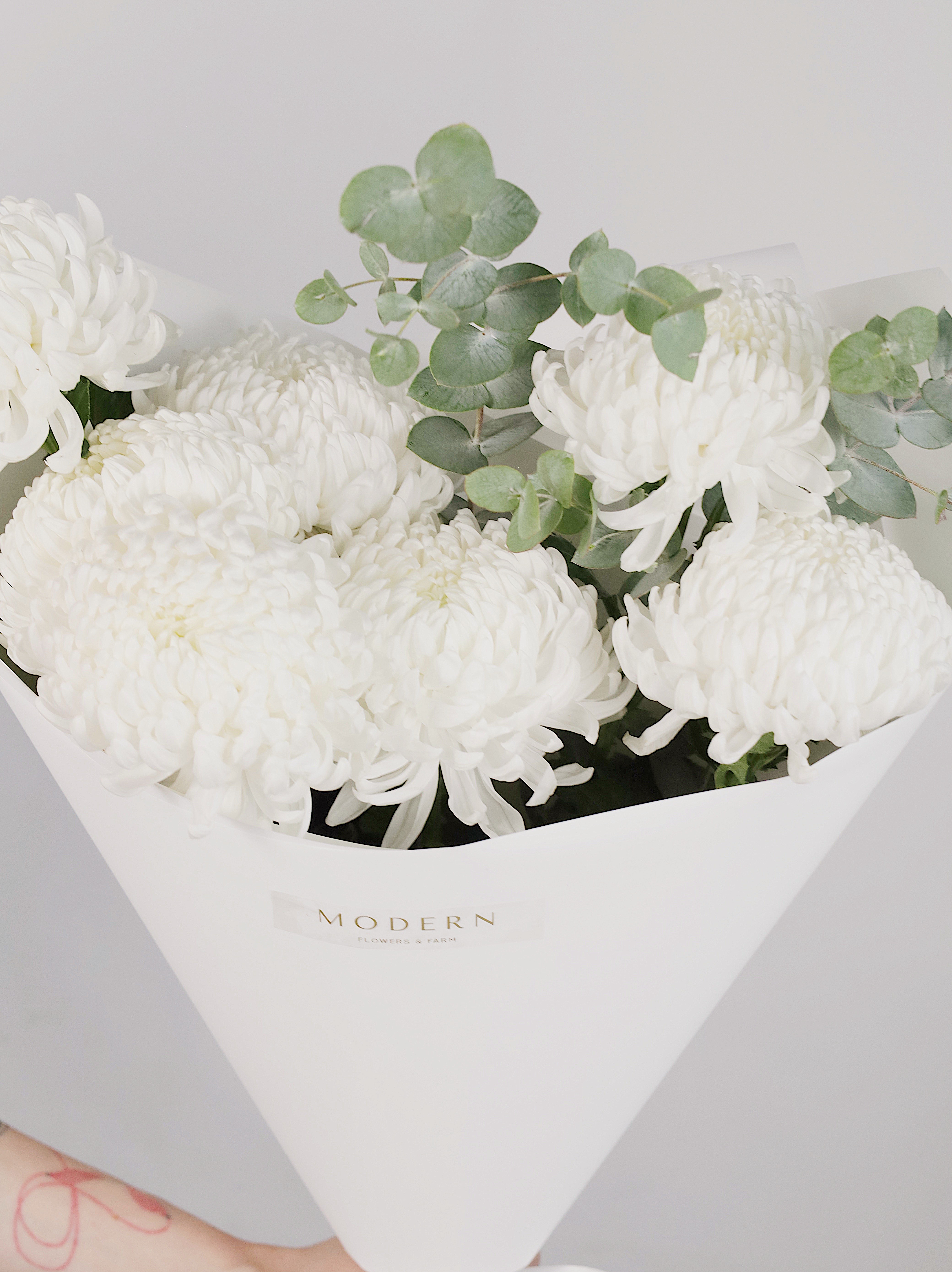 БУКЕТ С БЕЛОЙ ХРИЗАНТЕМОЙ И ЭВКАЛИПТОМ