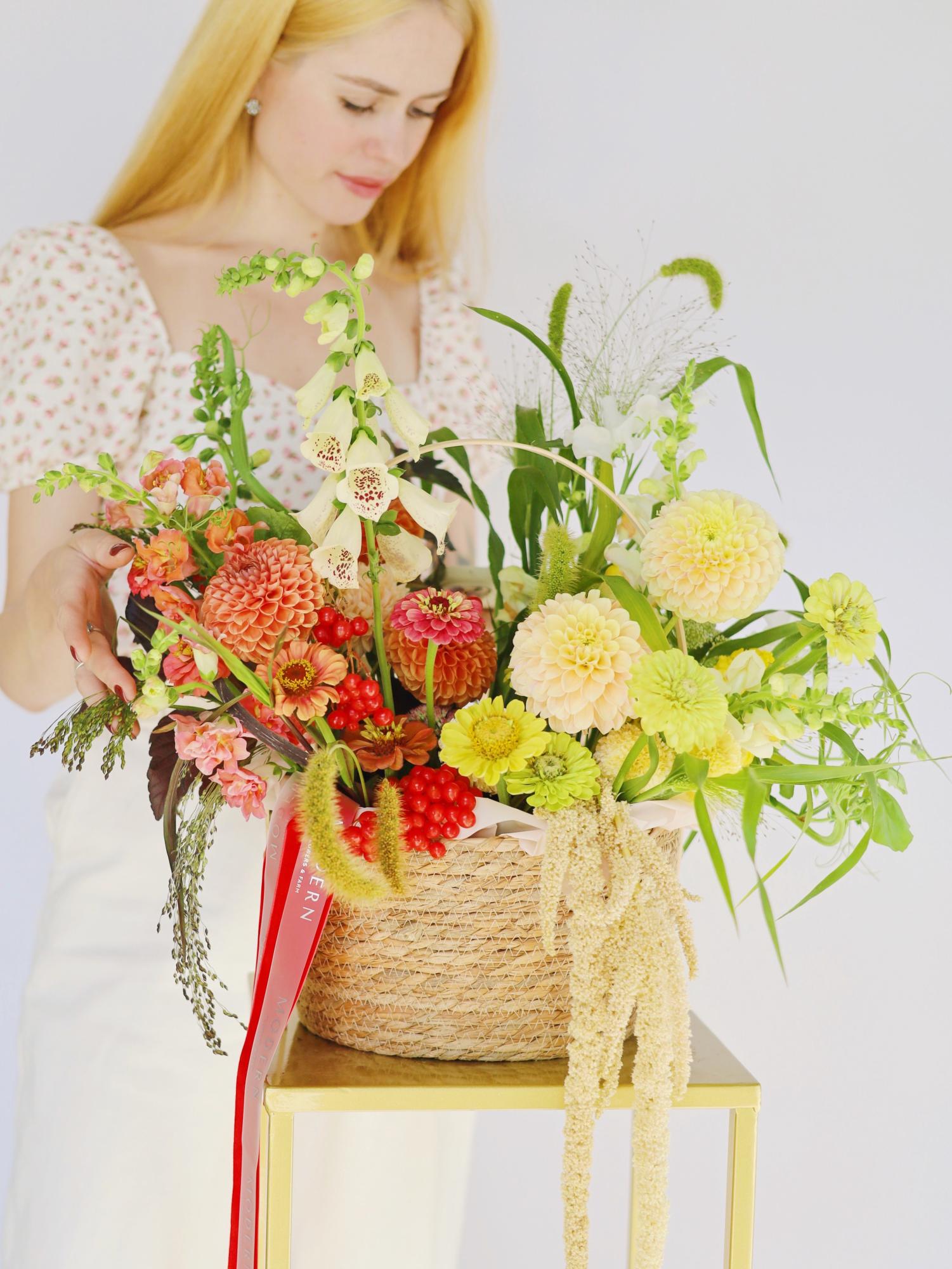 КОРЗИНА С ГЕОРГИНАМИ, НАПЕРСТЯНКОЙ И АМАРАНТОМ