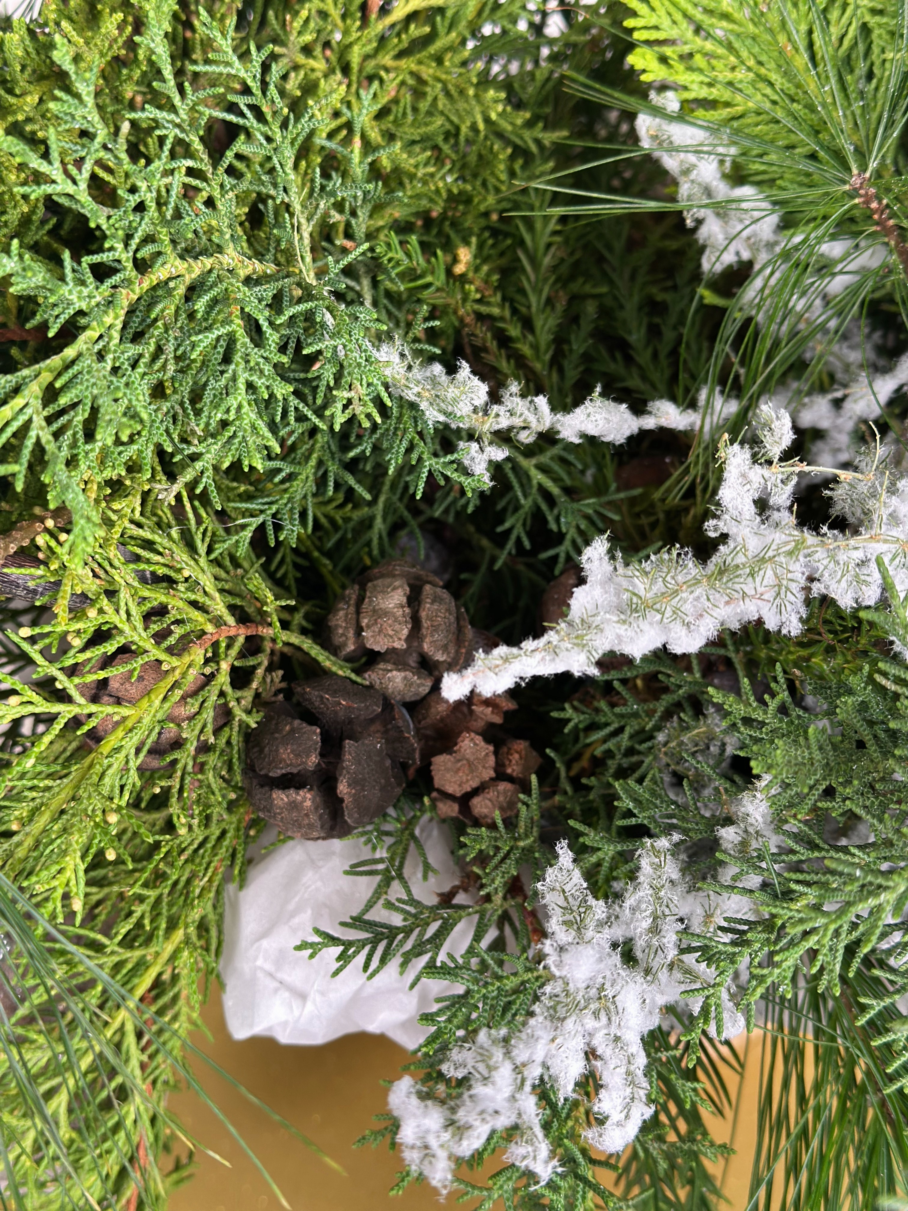 МИКС ХВОИ И ЗАСНЕЖЕННОГО АСПАРАГУСА В КОРЗИНЕ С ДЕКОРОМ