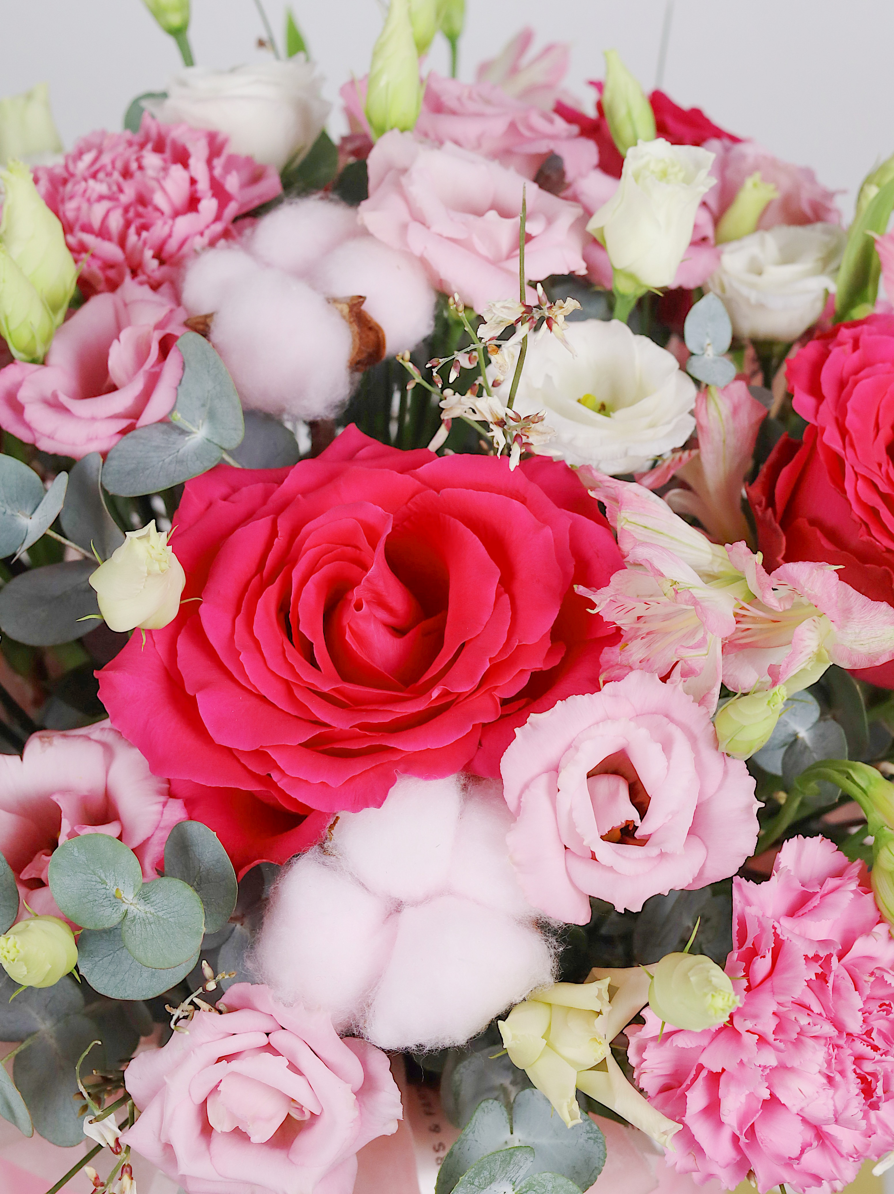 —ПИОНОВИДНАЯ РОЗА, ЭУСТОМА, АЛЬСТРОМЕРИЯ В БАРХАТНОЙ ШЛЯПНОЙ КОРОБКЕ
